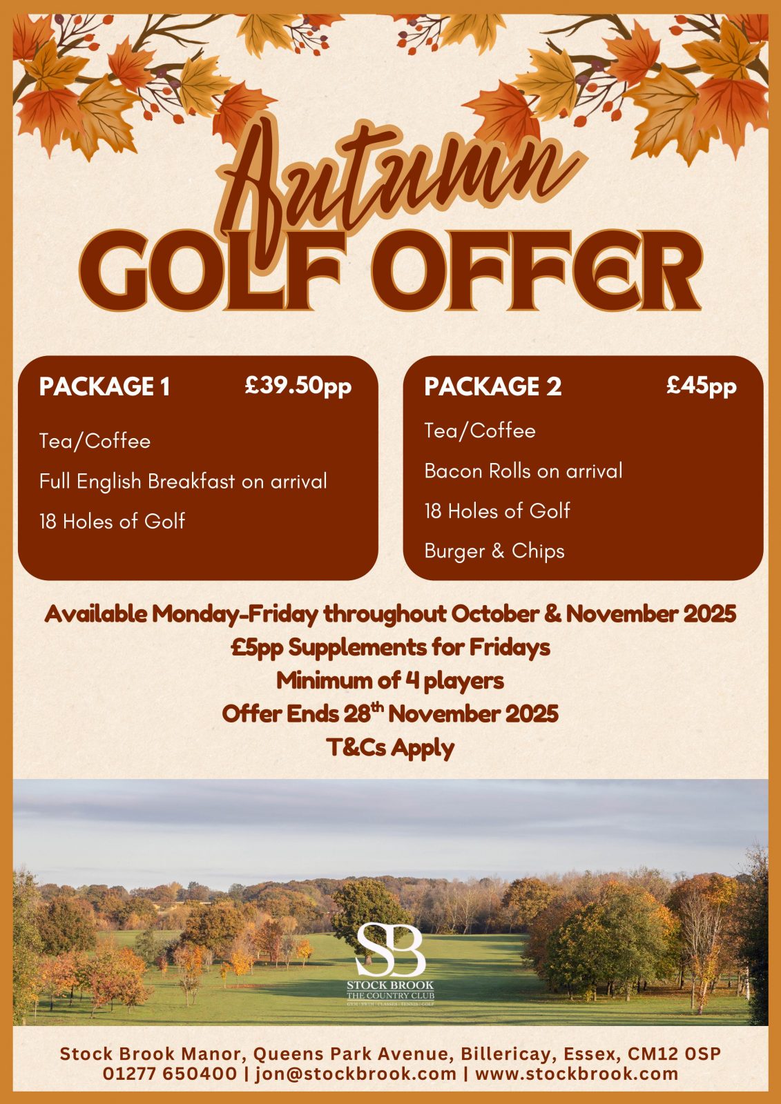 Autumn is the perfect season for golf! Join us at Stock Brook and enjoy our special autumn packages, including 18 holes of golf and delicious dining options – available until 28th November 2025.