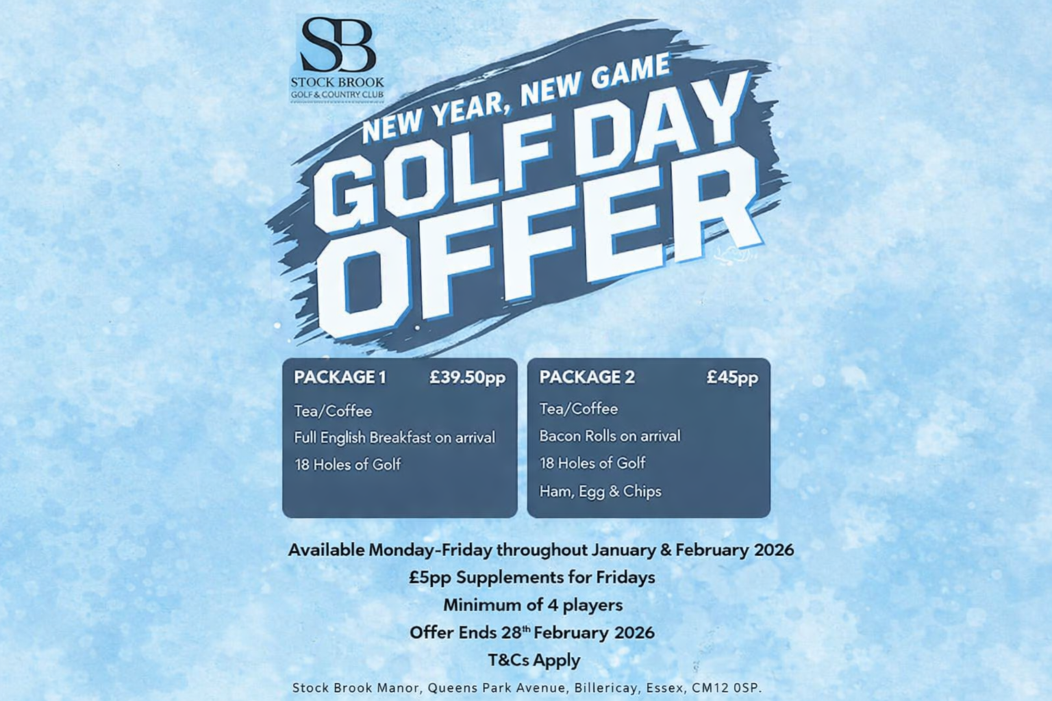 Plan the perfect Golf Day at Stock Brook. Enjoy 18 holes of golf, welcoming refreshments, and delicious dining options in a relaxed countryside setting. Available Monday to Friday until 28th February 2026.